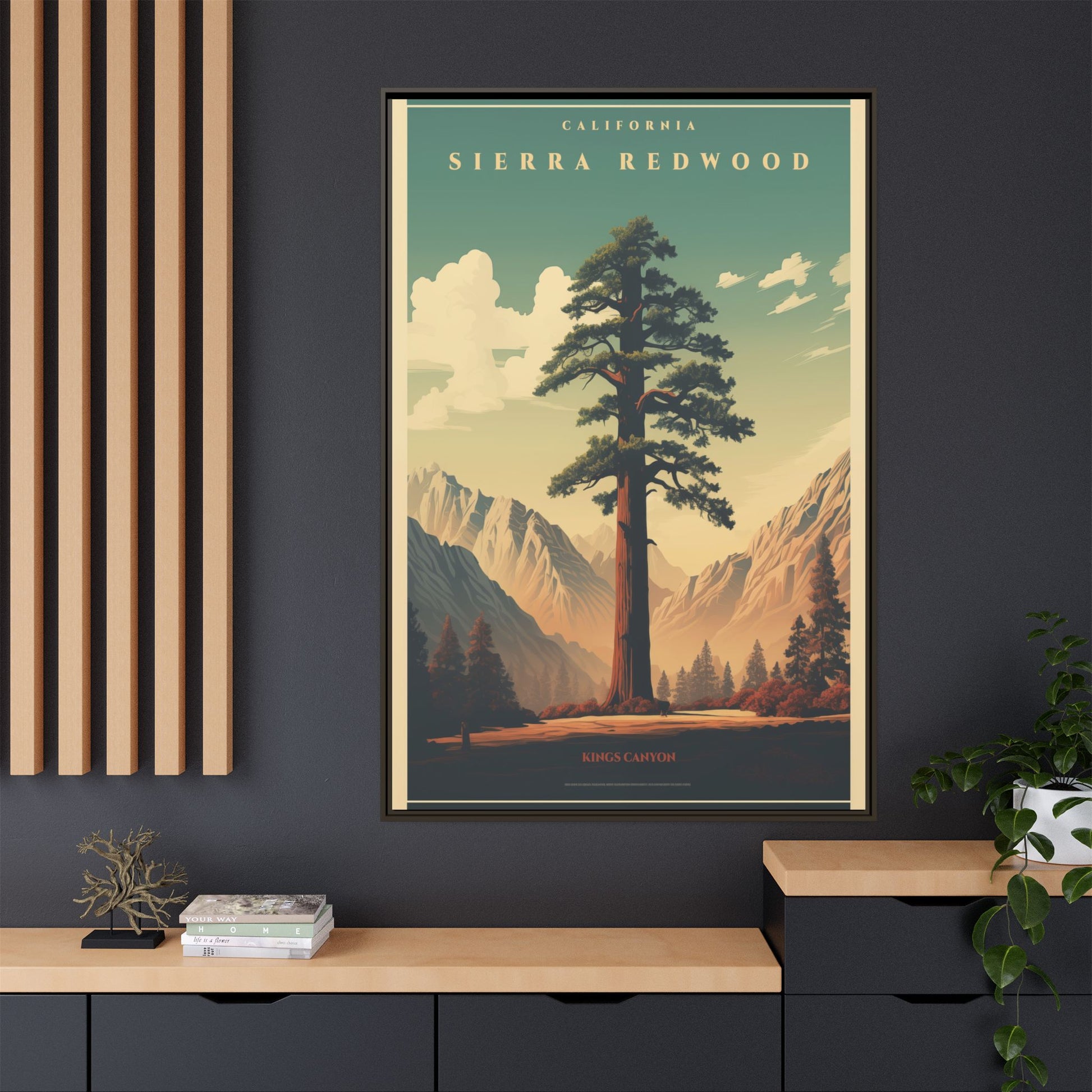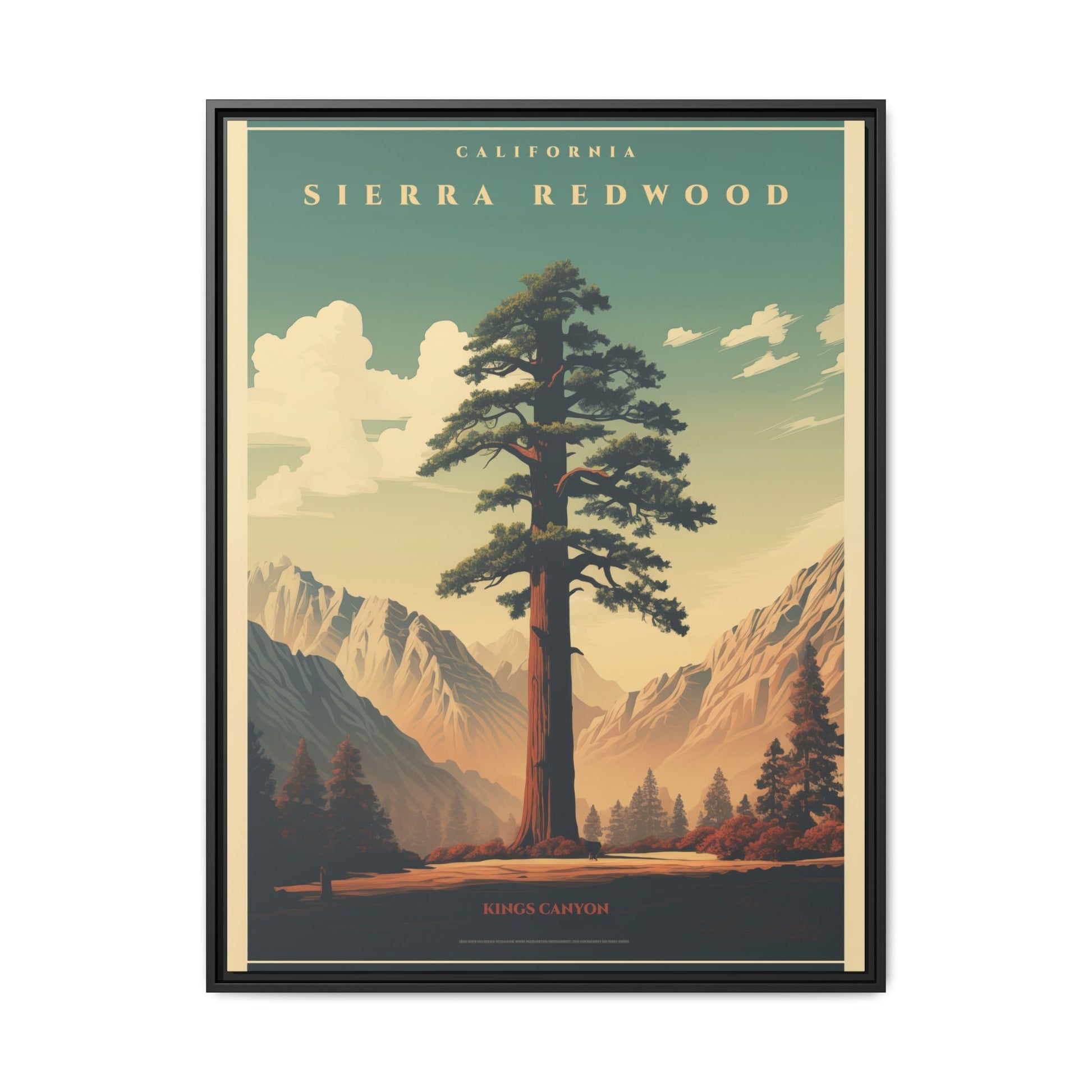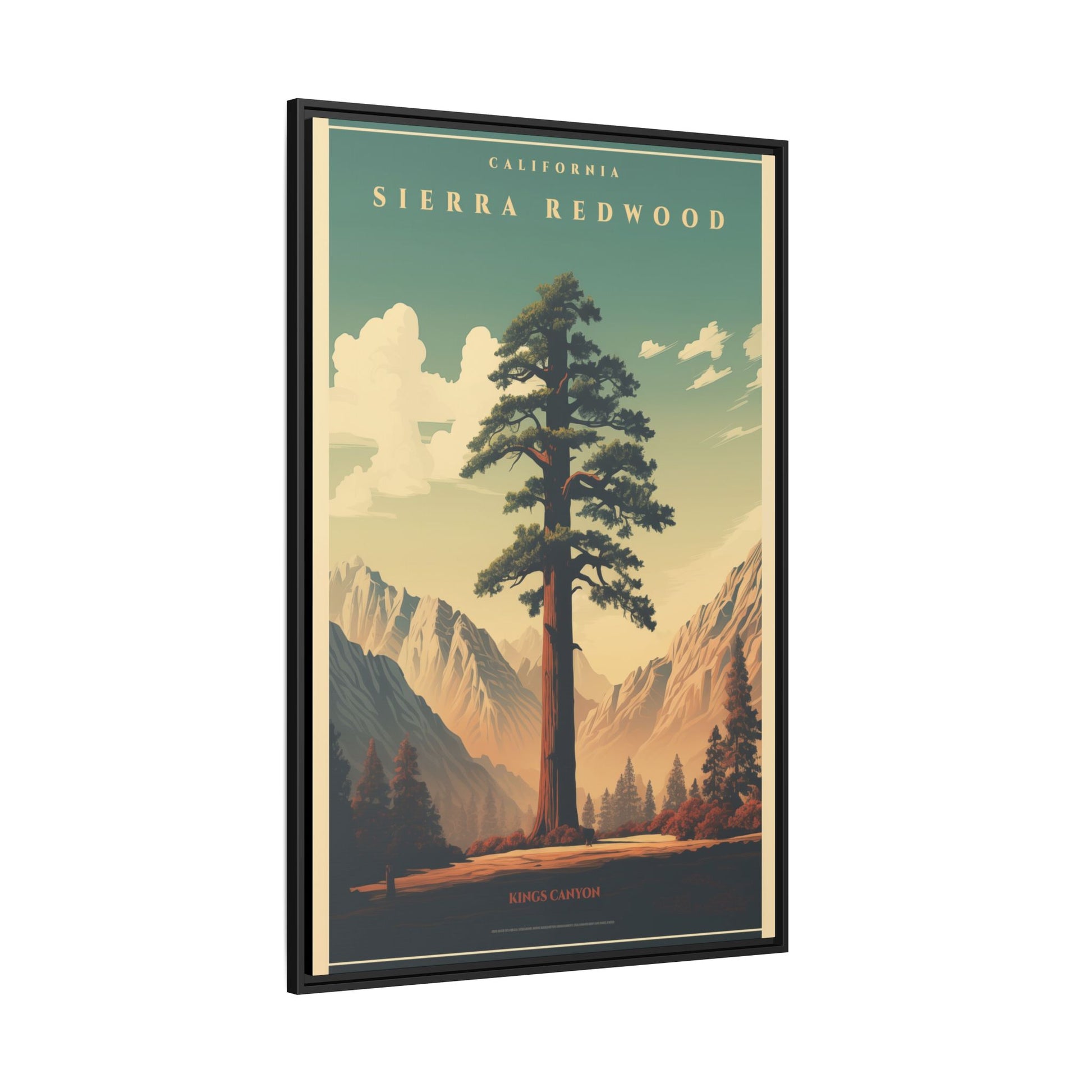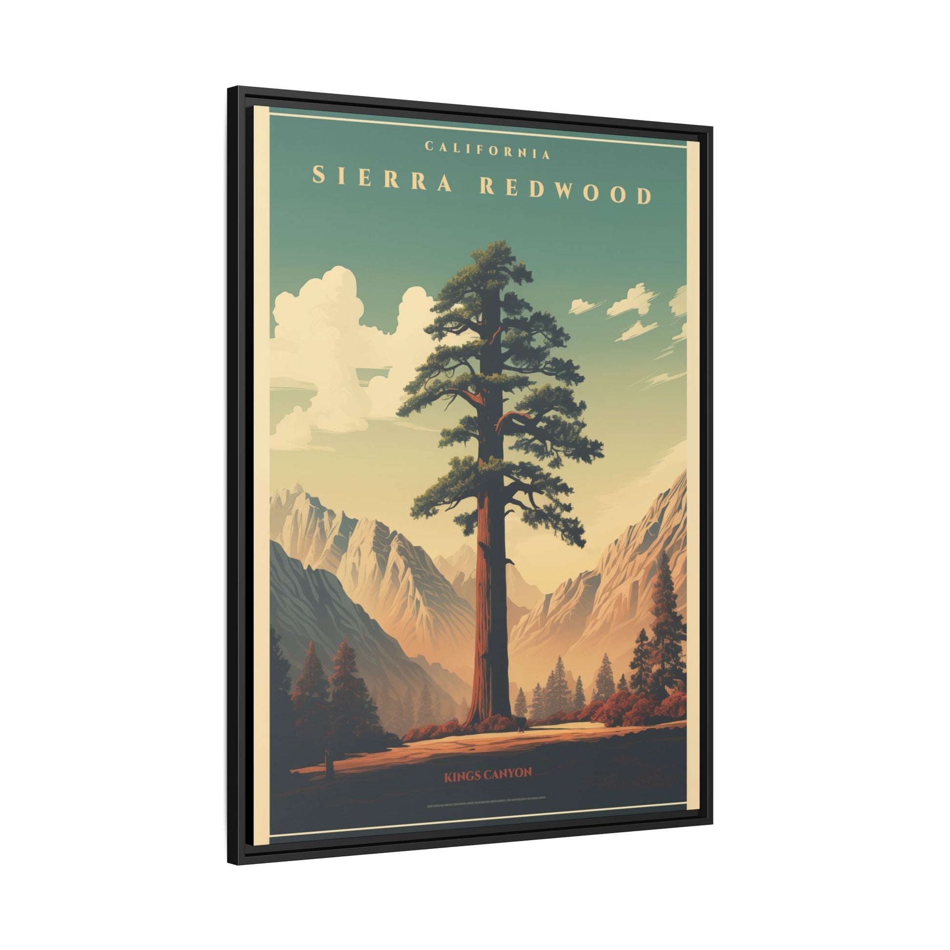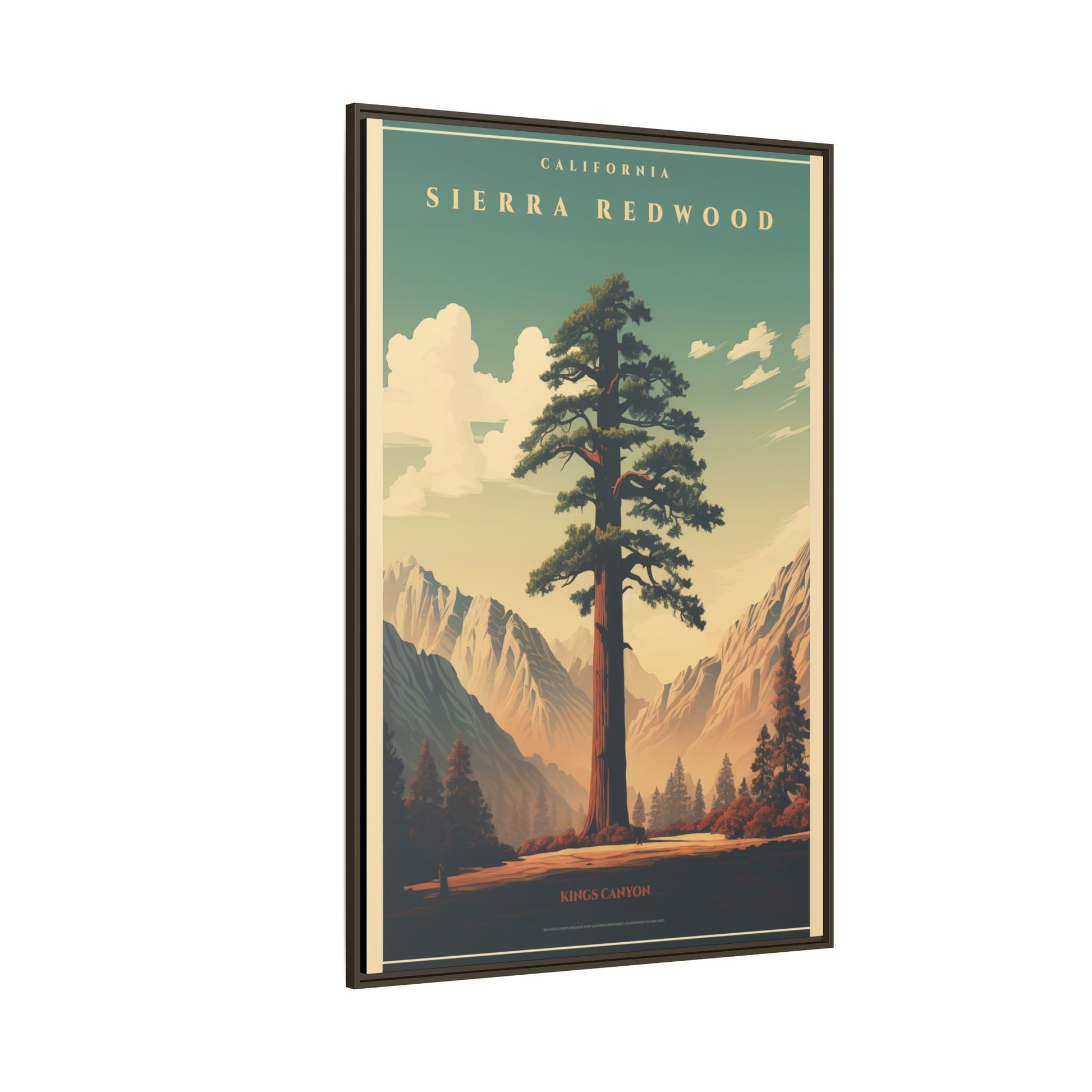 Bring a breath of the Sierra into your space with a matte, multi-color framed canvas that feels both nostalgic and alive. The composition’s towering redwood and sunlit valley invite quiet mornings and slow afternoons—this piece settles into a room the way a good window does. The slim pine frame and soft matte finish reduce glare while letting the rich, retro-inspired palette sing: teal skies, warm earth tones, and sculpted shadows. Hang it in a living room, hallway, or cabin nook to anchor a nature-focused corner and start conversations about trails, sunsets, and remembered hikes.