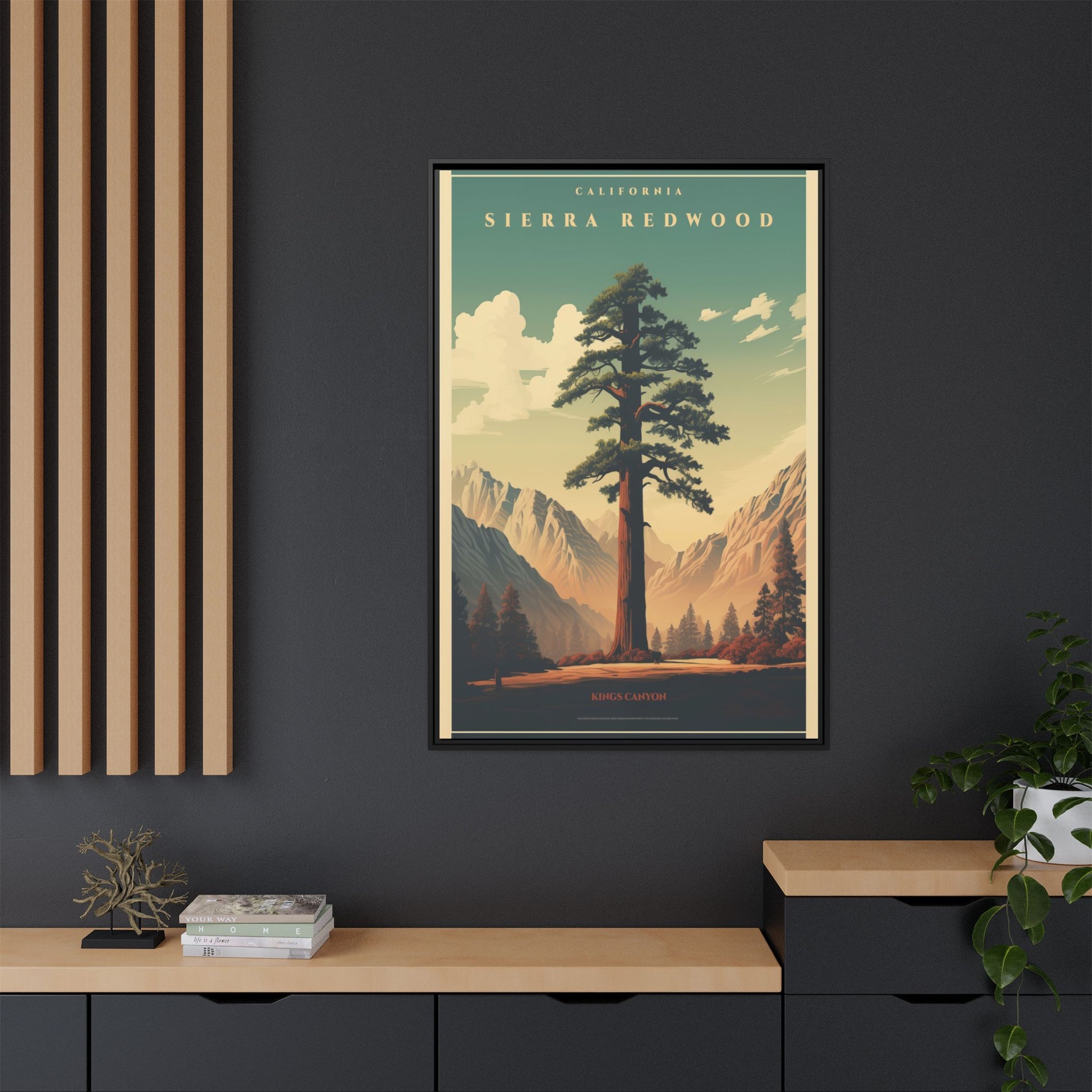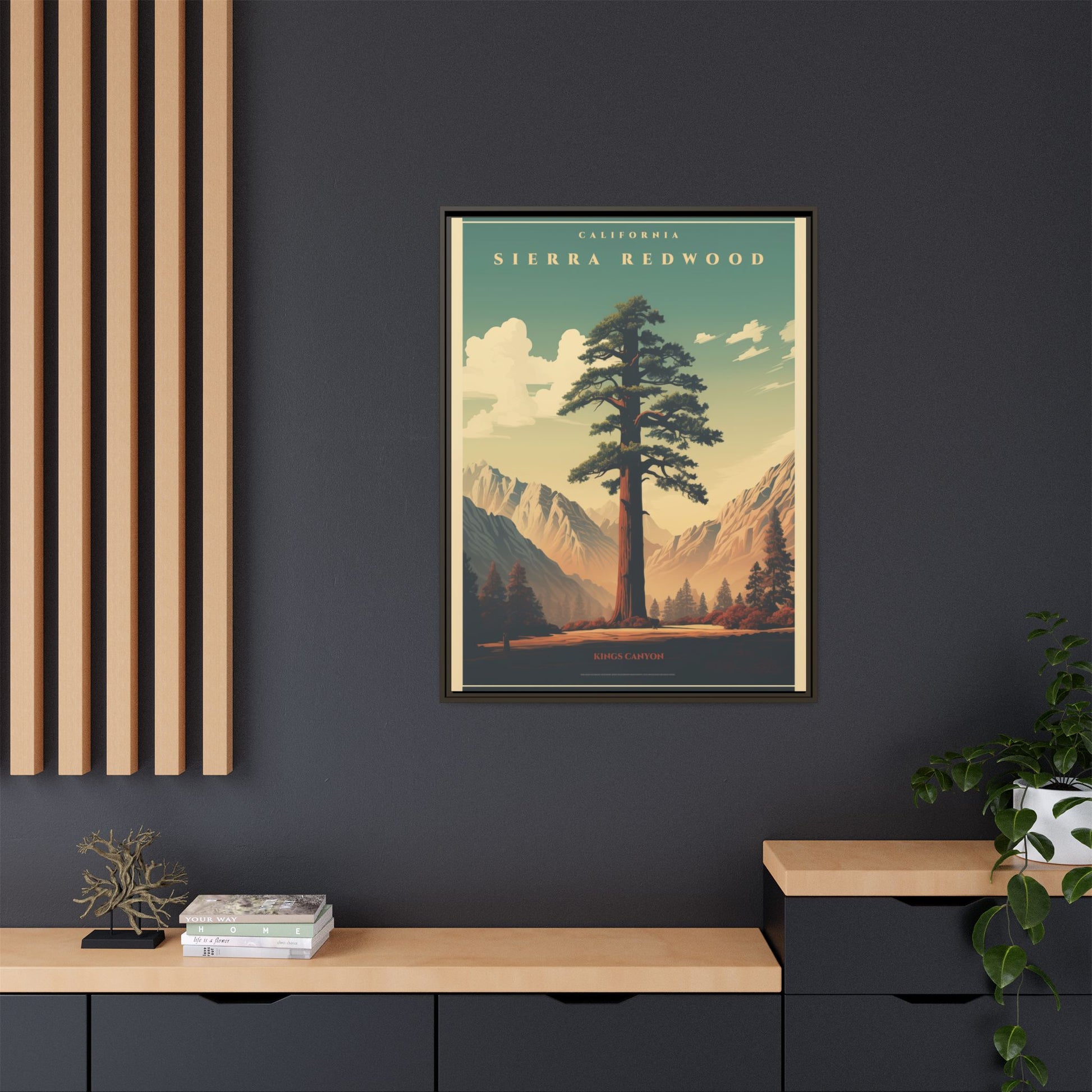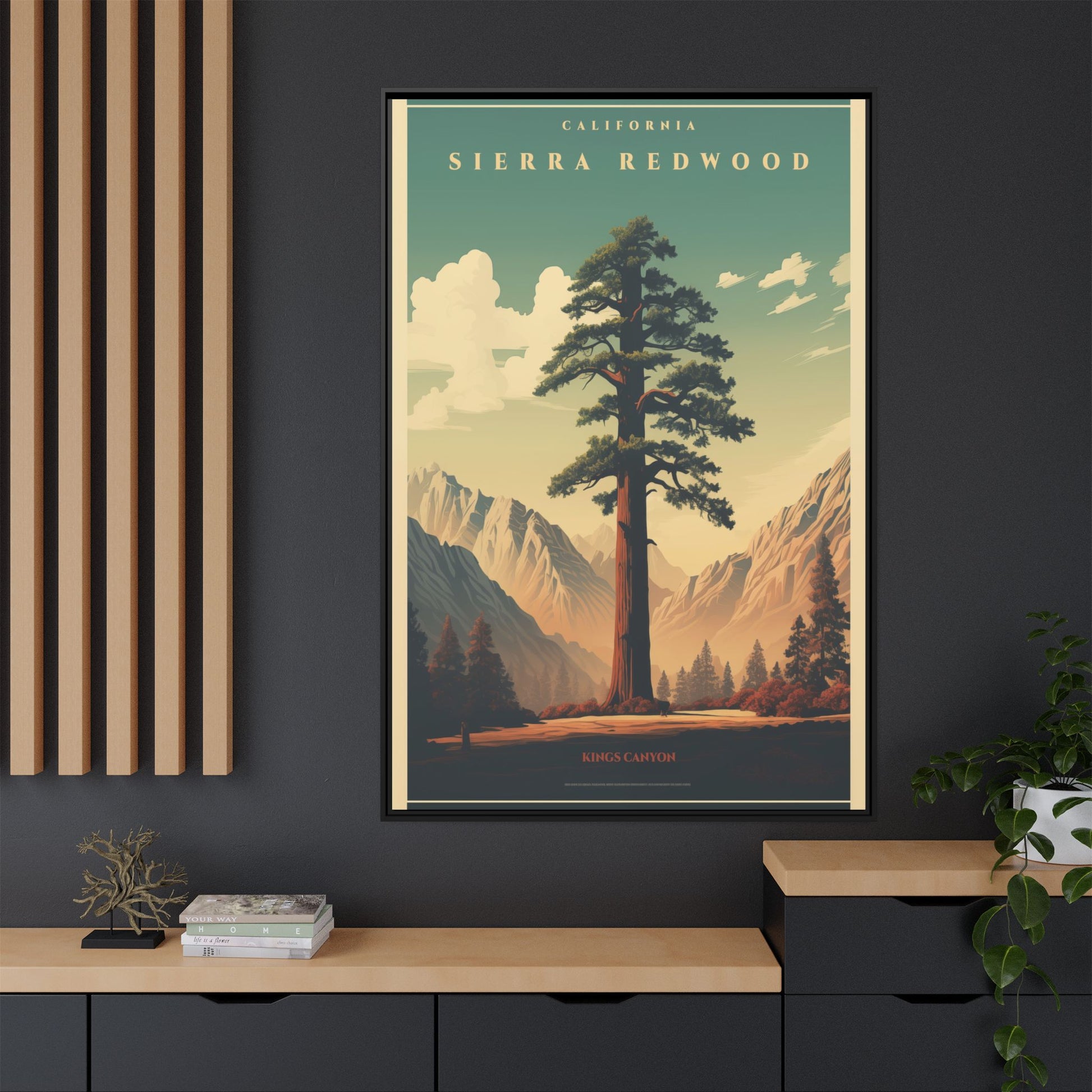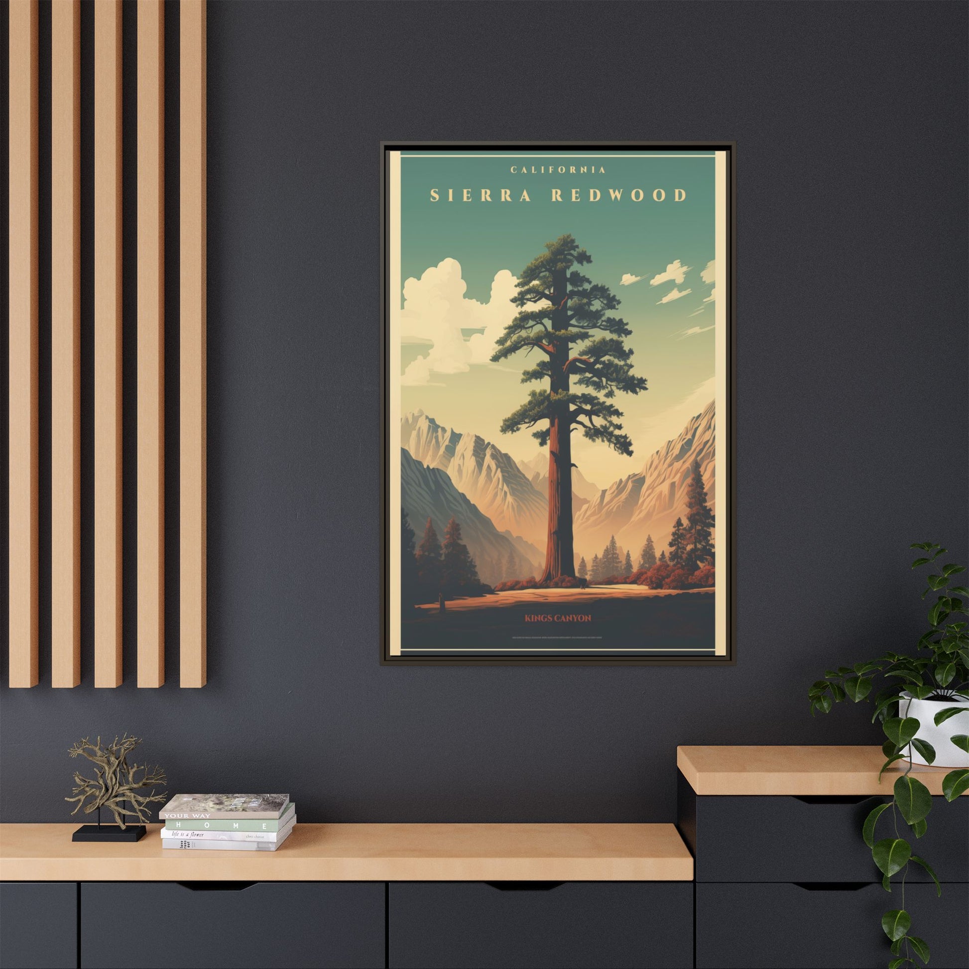 Bring a breath of the Sierra into your space with a matte, multi-color framed canvas that feels both nostalgic and alive. The composition’s towering redwood and sunlit valley invite quiet mornings and slow afternoons—this piece settles into a room the way a good window does. The slim pine frame and soft matte finish reduce glare while letting the rich, retro-inspired palette sing: teal skies, warm earth tones, and sculpted shadows. Hang it in a living room, hallway, or cabin nook to anchor a nature-focused corner and start conversations about trails, sunsets, and remembered hikes.