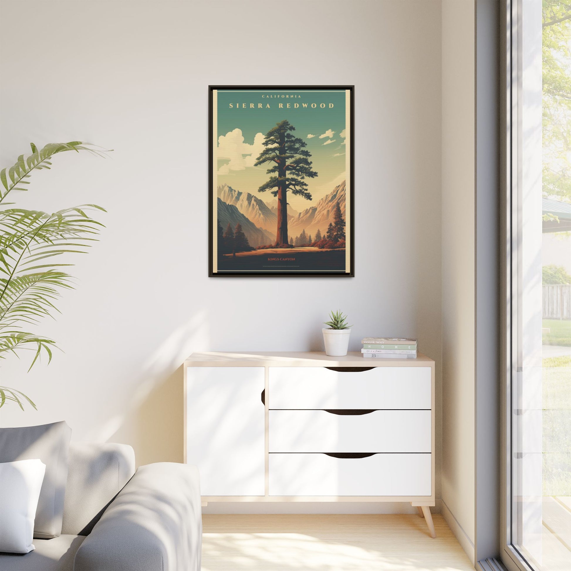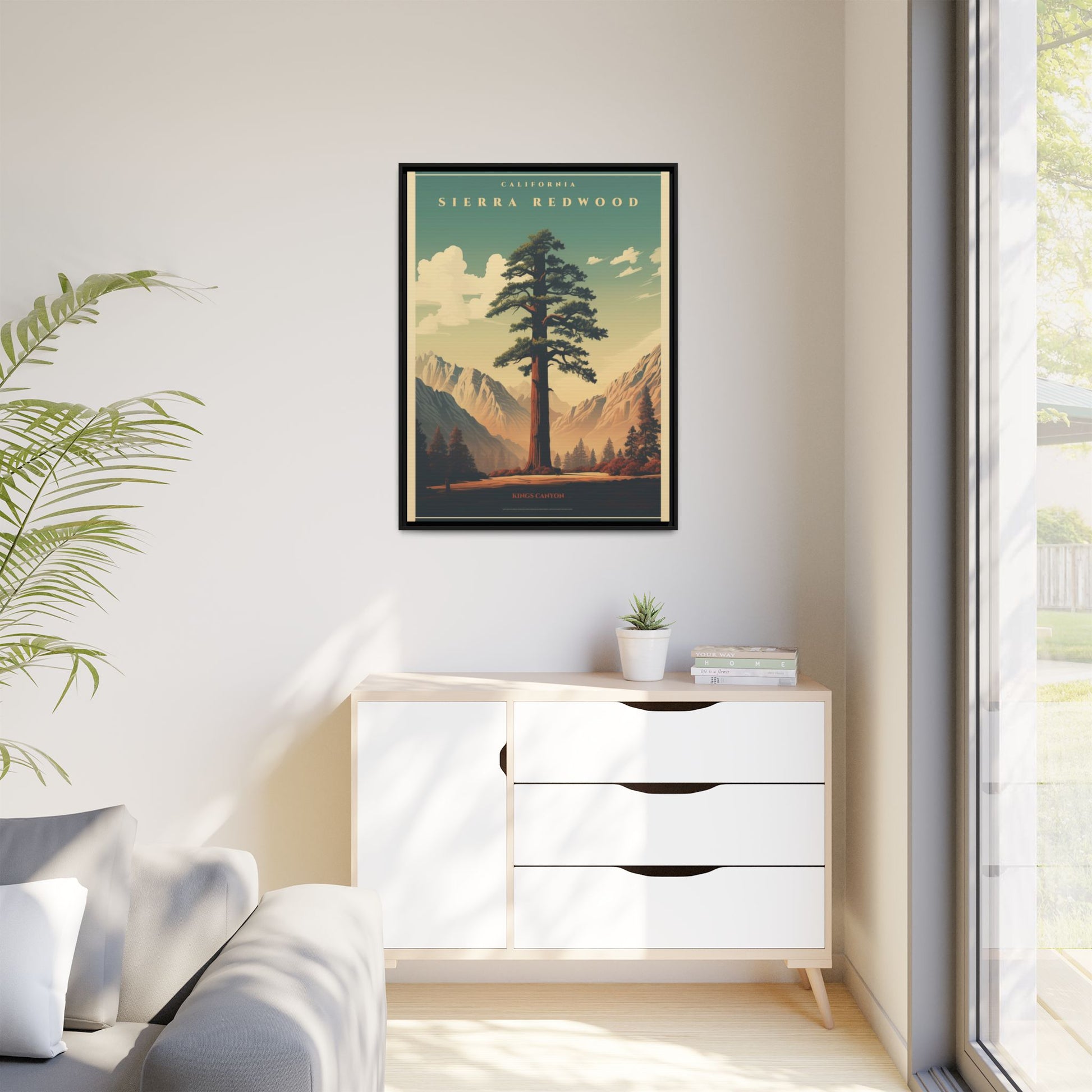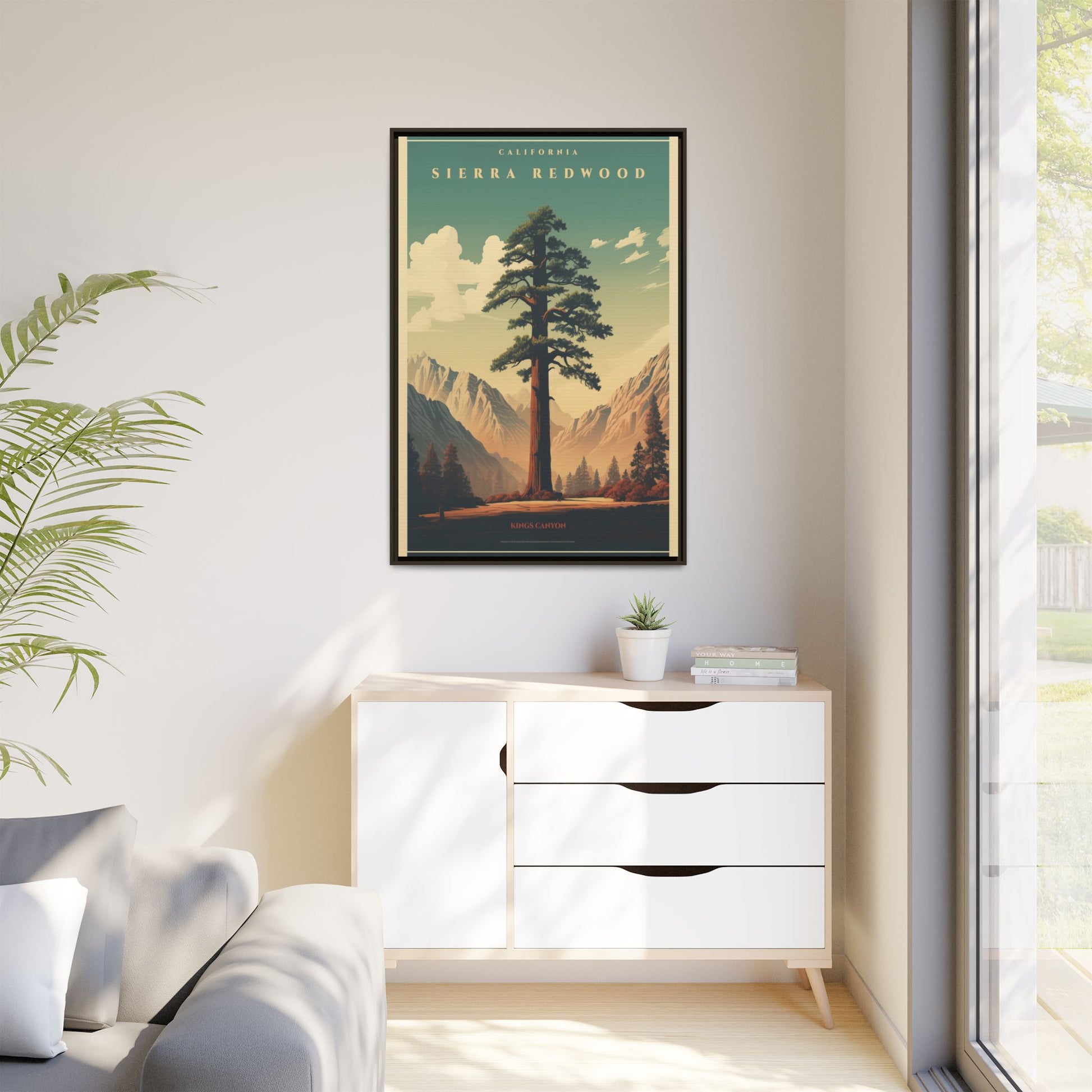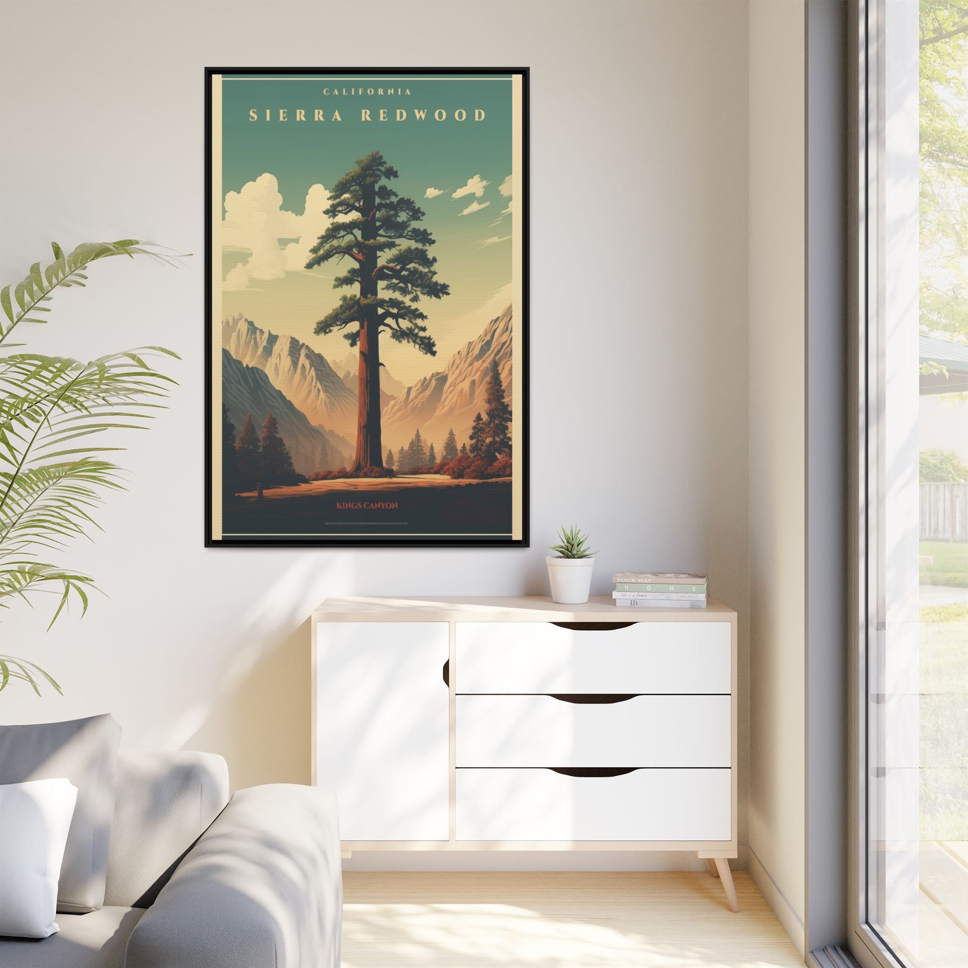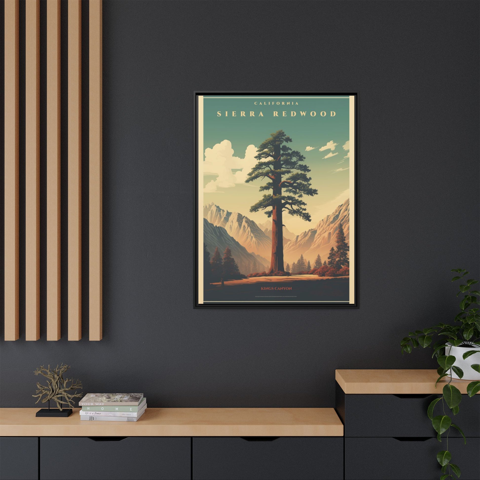 Bring a breath of the Sierra into your space with a matte, multi-color framed canvas that feels both nostalgic and alive. The composition’s towering redwood and sunlit valley invite quiet mornings and slow afternoons—this piece settles into a room the way a good window does. The slim pine frame and soft matte finish reduce glare while letting the rich, retro-inspired palette sing: teal skies, warm earth tones, and sculpted shadows. Hang it in a living room, hallway, or cabin nook to anchor a nature-focused corner and start conversations about trails, sunsets, and remembered hikes.