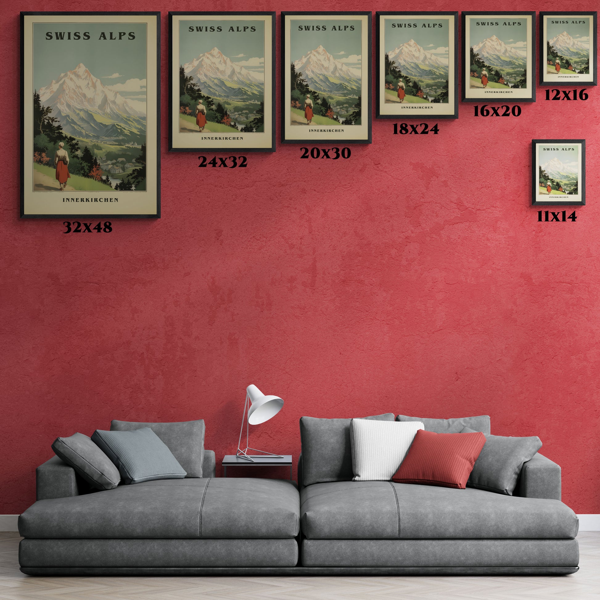 Experience the timeless beauty of the Swiss Alps with this captivating vintage travel poster featuring Innerkirchen, a picturesque village nestled in the heart of the Bernese Alps. This artwork showcases a serene scene of a woman admiring the stunning landscape of snow-capped mountains, lush greenery, and quaint Alpine architecture. Perfect for adding a touch of Swiss charm to your decor, this poster captures the nostalgic essence of classic travel.