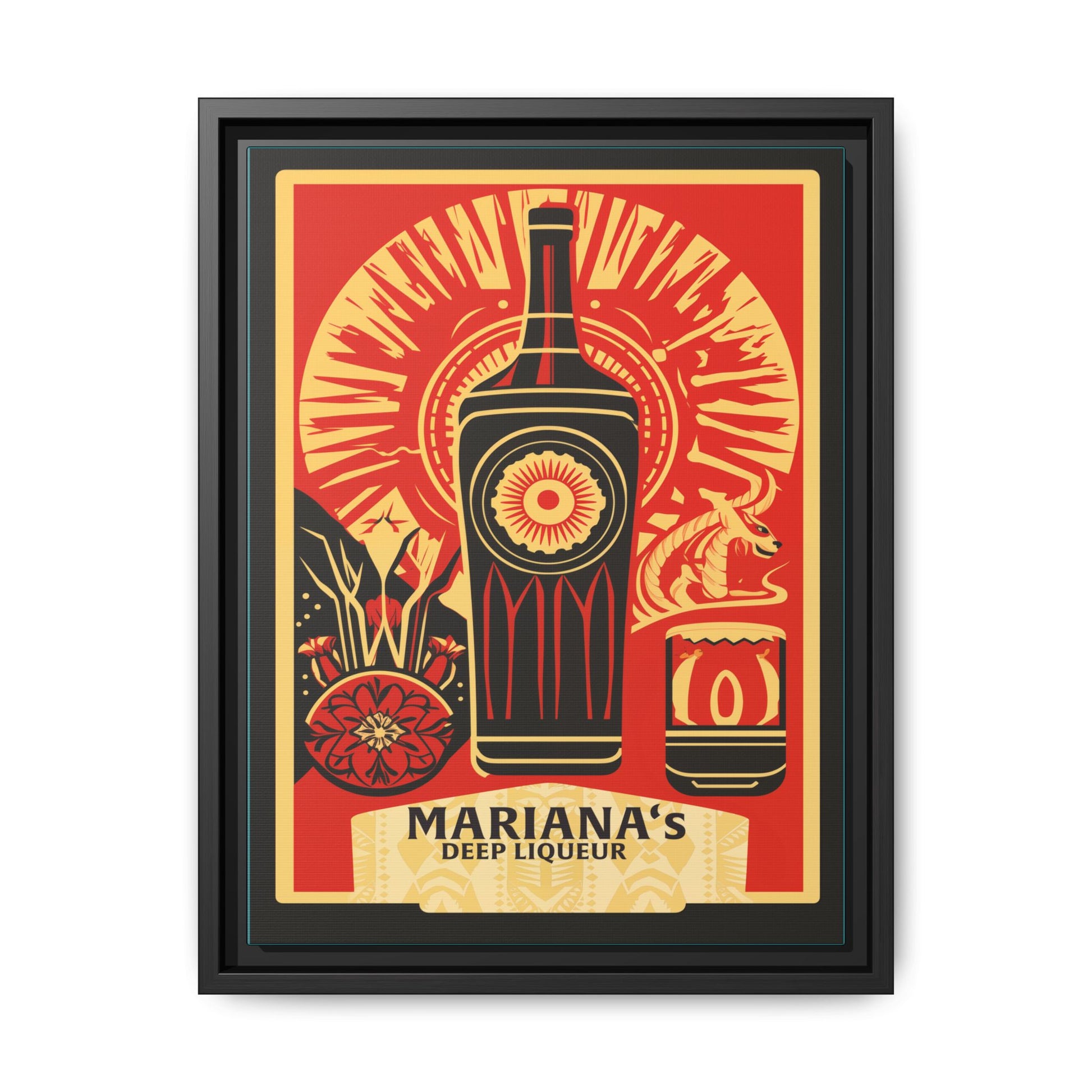 Indulge in the intricate artistry of this Vintage Mariana's Deep Liqueur Artwork, featuring a central bottle design surrounded by radiant patterns, bold floral elements, and striking details. The rich red and gold tones convey a sense of luxury and warmth, making it a perfect centerpiece for any space. Framed in a sleek black finish, this matte canvas combines timeless elegance with modern craftsmanship.