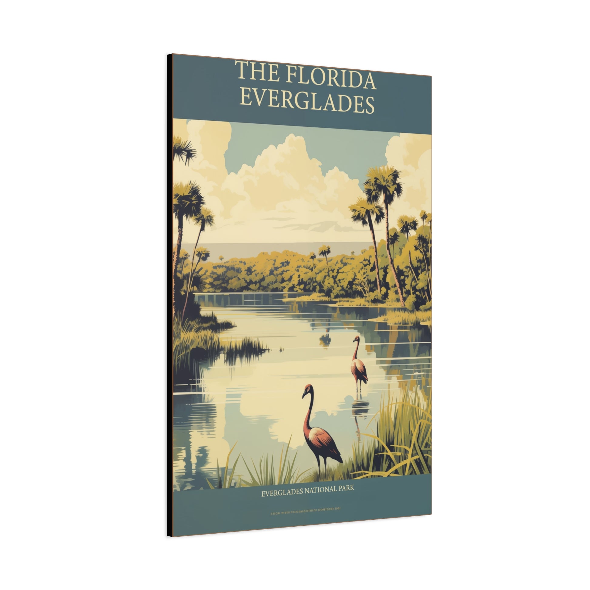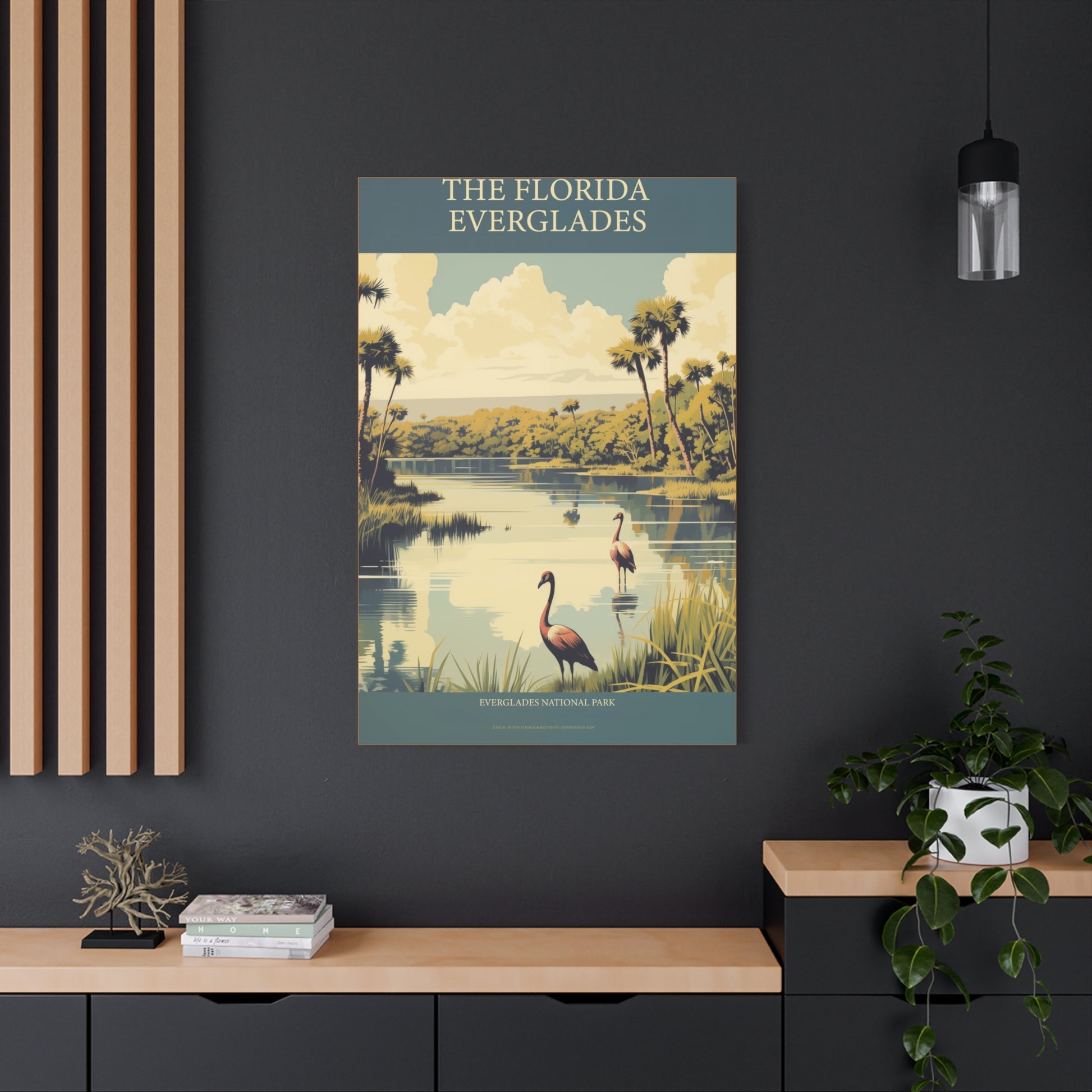 Experience the natural allure of the Florida Everglades with this elegant vintage-style canvas print. Featuring graceful flamingos amidst lush vegetation and a serene waterway, this artwork beautifully celebrates the iconic landscapes of Everglades National Park. Perfect for nature lovers and art enthusiasts alike.